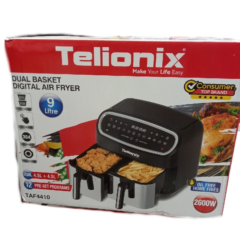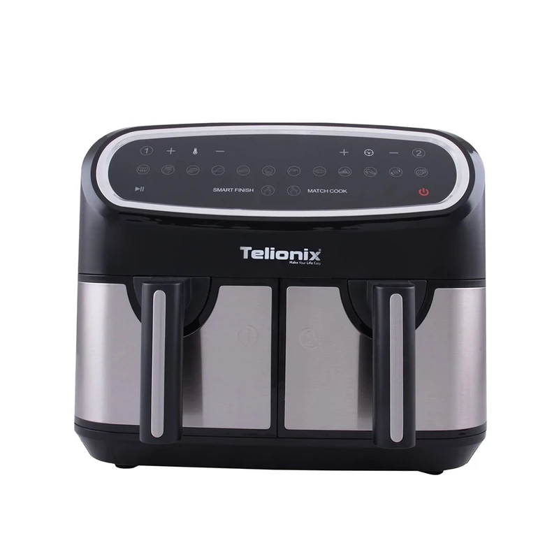 قابلیت پخت کیک، میگو، ماهی، پیش گرمایش، سیب زمینی سرخ شده،نان، مرغ، گوشت، پیتزا، سبزیجات، گرم کردن مجدد و خشک کردن میوه پخت و پز بصورت هم زمان در هر دو ظرف و یا تنها در یکی از ظروفقابلیت پخت و پز هم زمان دو غذای متفاوت و یا یکسان در دو ظرفمجهز به سیستم چرخش هوای سریع گرم جهت پخت و پزقابلیت پخت و پز تا 80% چربی کمتر و یا حتی کاملا بدون روغندارای کنترل پنل تمام لمسیکشوهای از جنس استیل S/Sدارای بدنه مستحکم از جنس فلزیسرخ کن دوقلو تلیونیکس با بهره گیری از فناوری منحصر بفرد جریان هوای سریع موجب پخت کامل انواع مواد غذایی می شود. جریان سریع هوای گرم موجب می شود لایه های داخلی غذا کاملا نرم شود. این محصول با توان 2600 واتی خود، دارای دوظرف با گنجایش چهارونیم لیتری می باشد که گنجایش کامل آن 9لیتر می باشد. جنس دیگ از تفلون نچسب است. پخت به وسیله چرخش هوای گرم اتفاق می افتد که تا 80 درصد کاهش مصرف روغن را به دنبال دارد. این محصول قابلیت سرخ کردن، گریل کردن و پختن کیک را دارد. طول سیم حدود یک متر است. دارای دسته های عایق است.